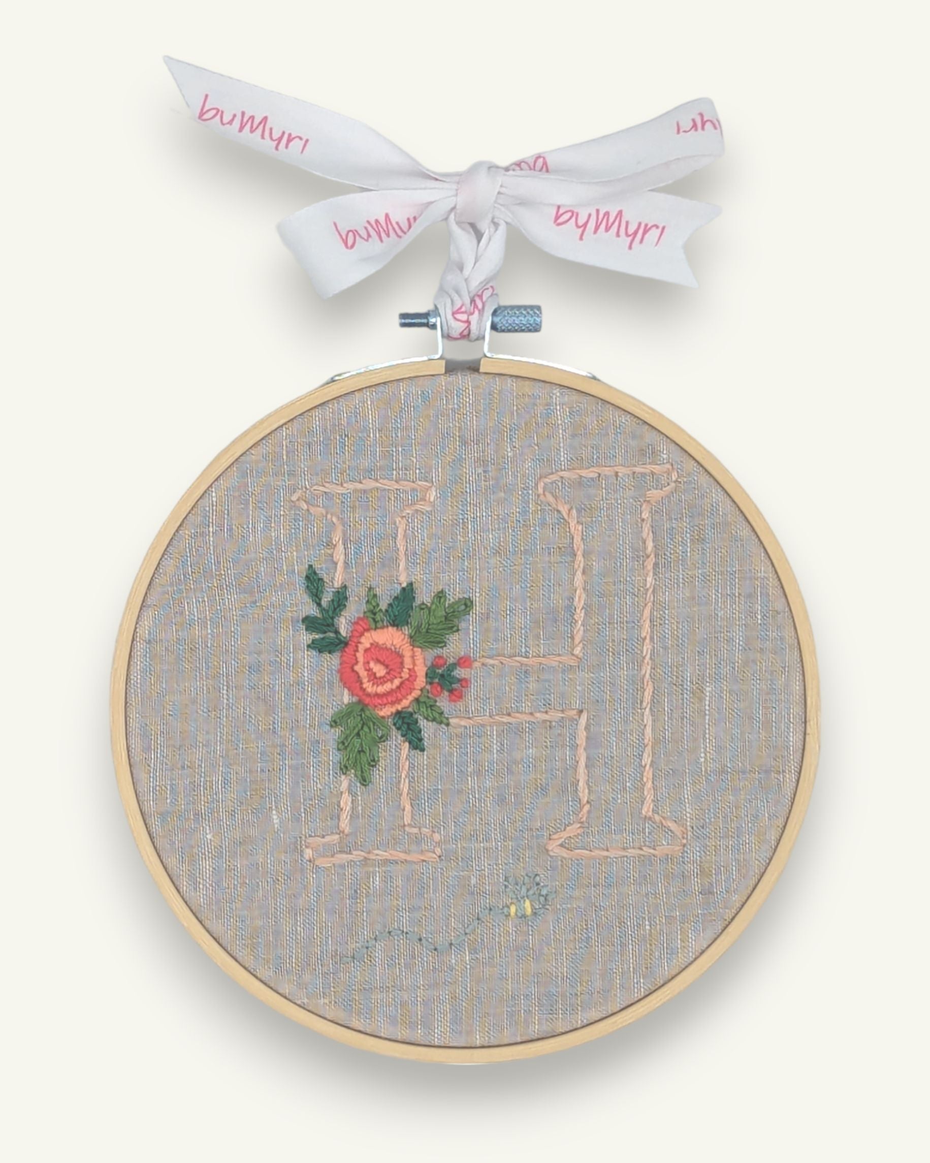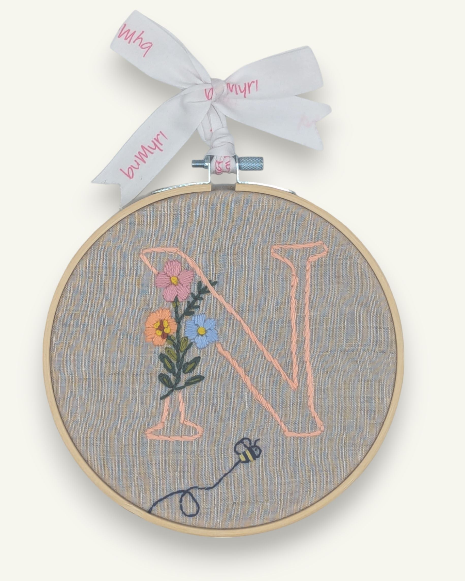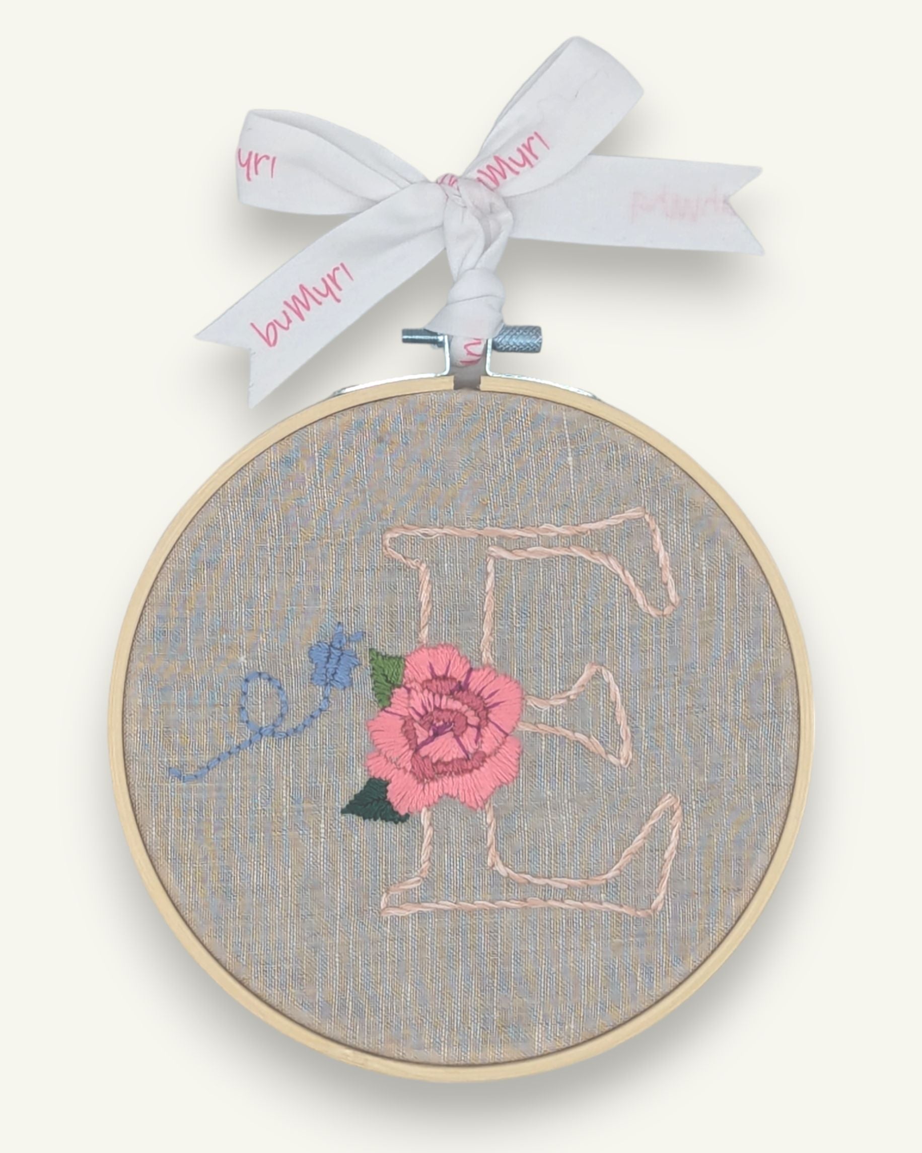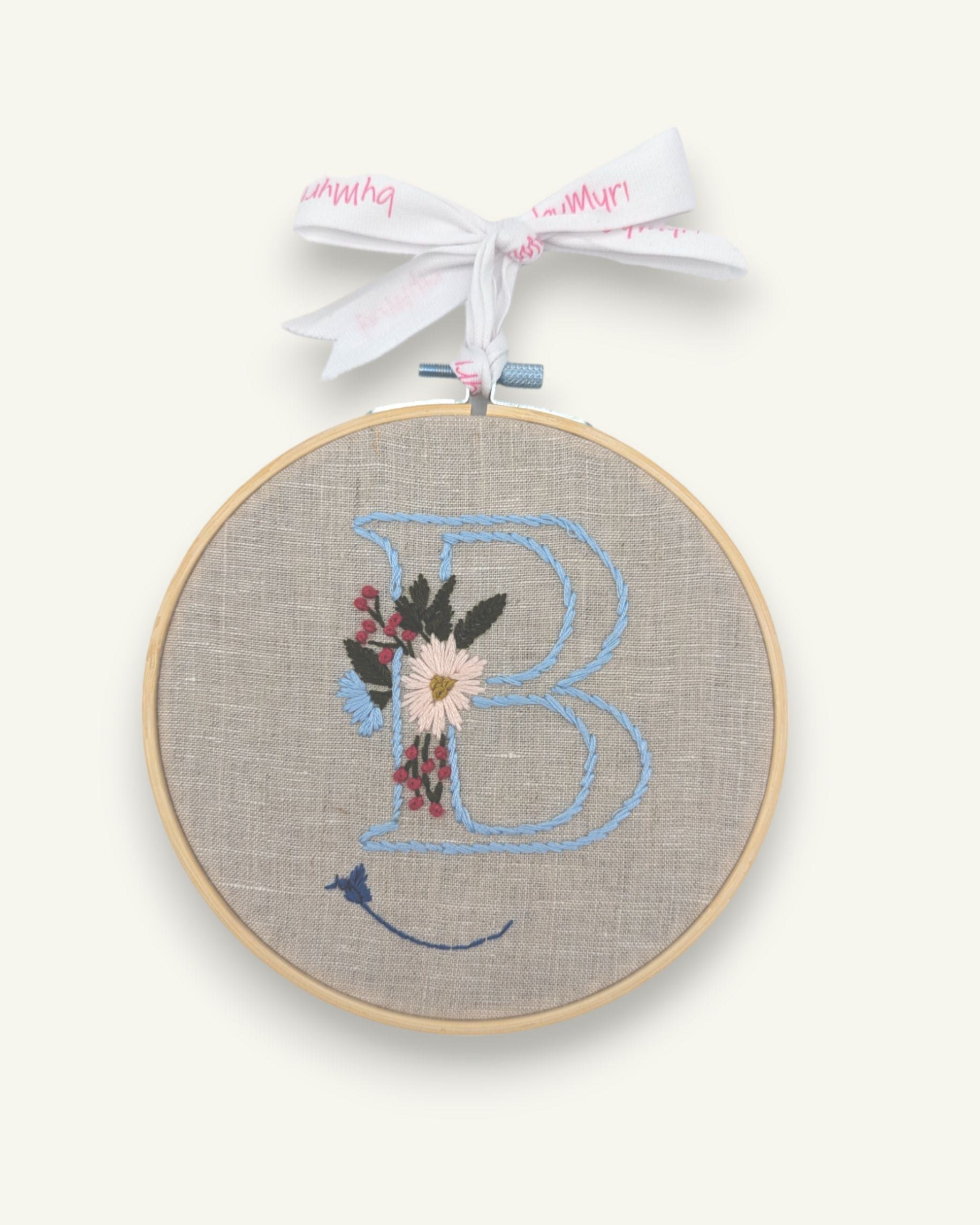 Este cuadrito con la inicial bordada de tu bébé quedará precioso en su cuarto.