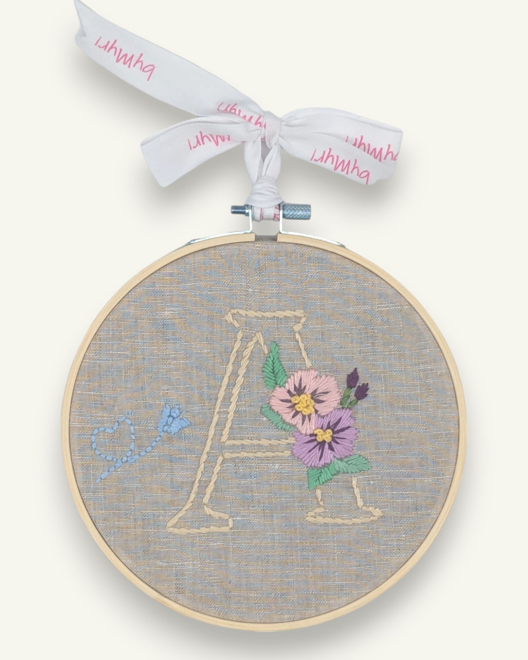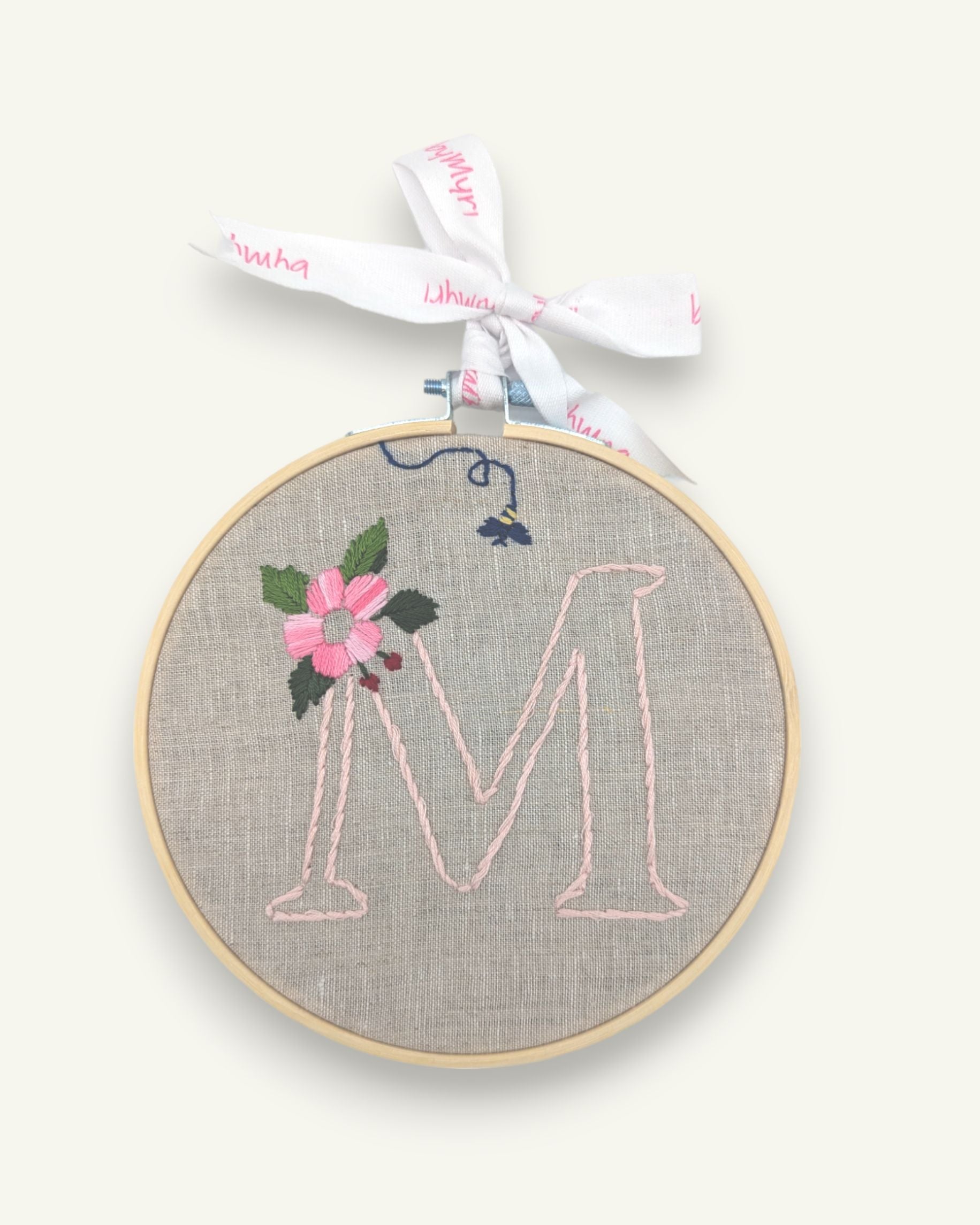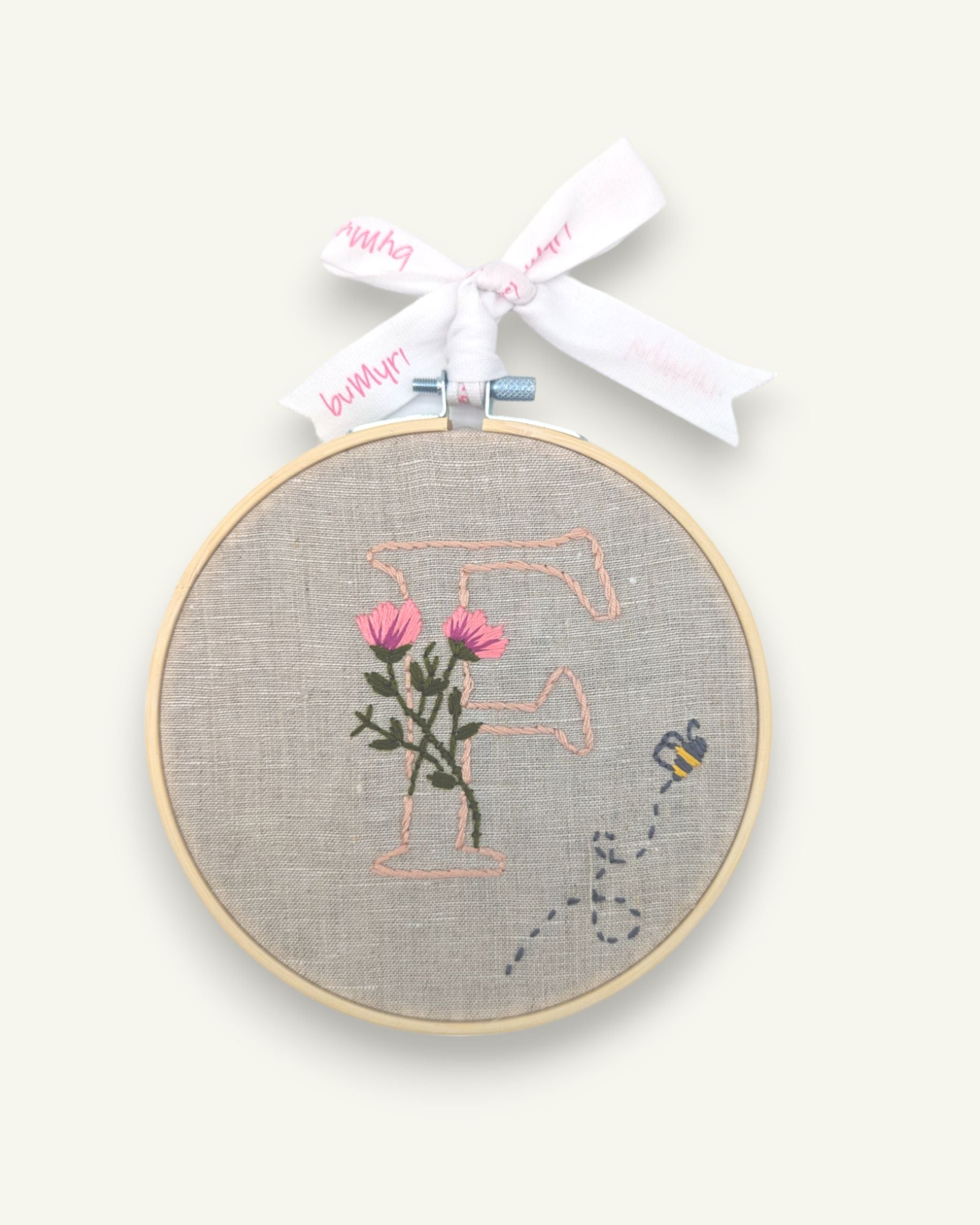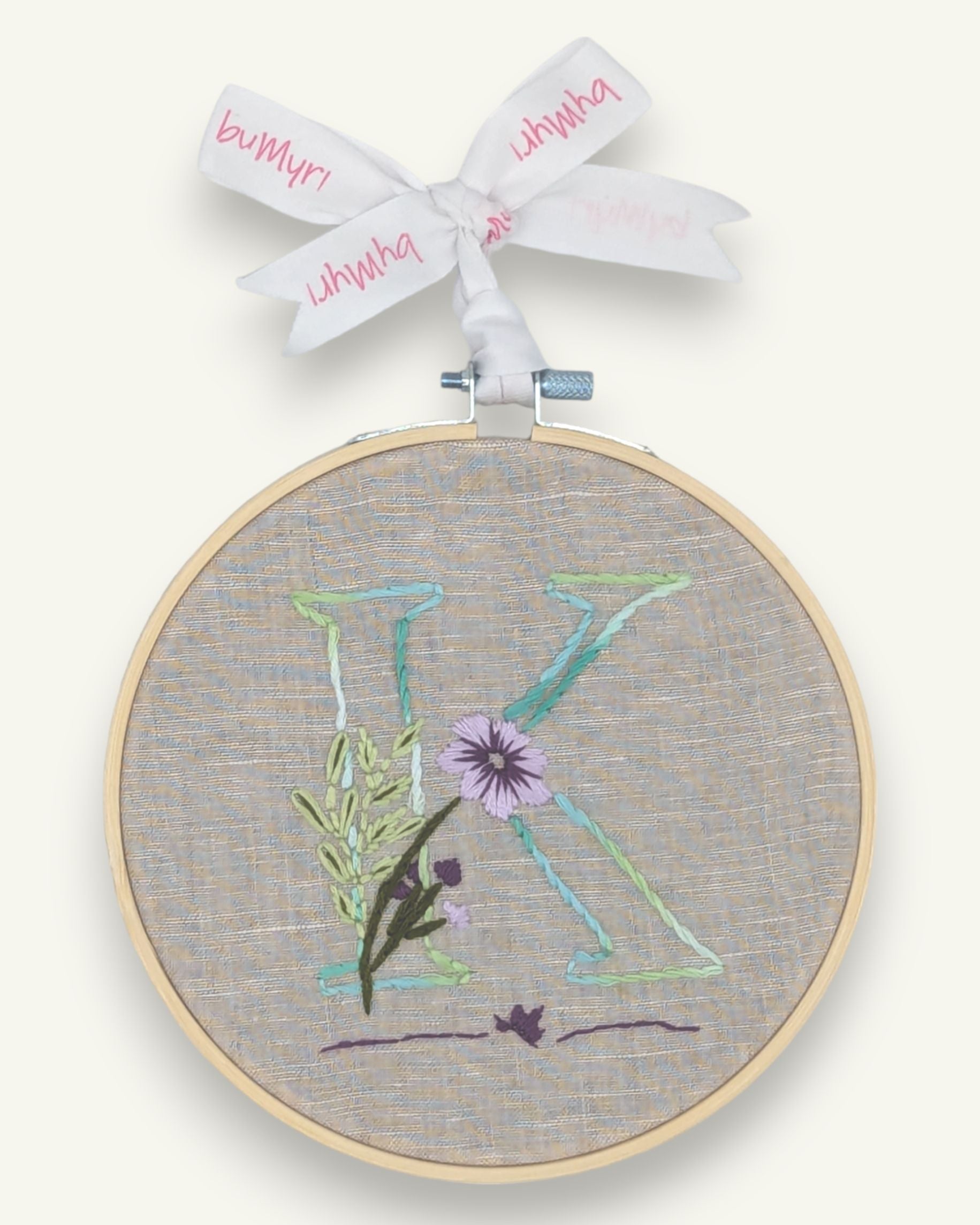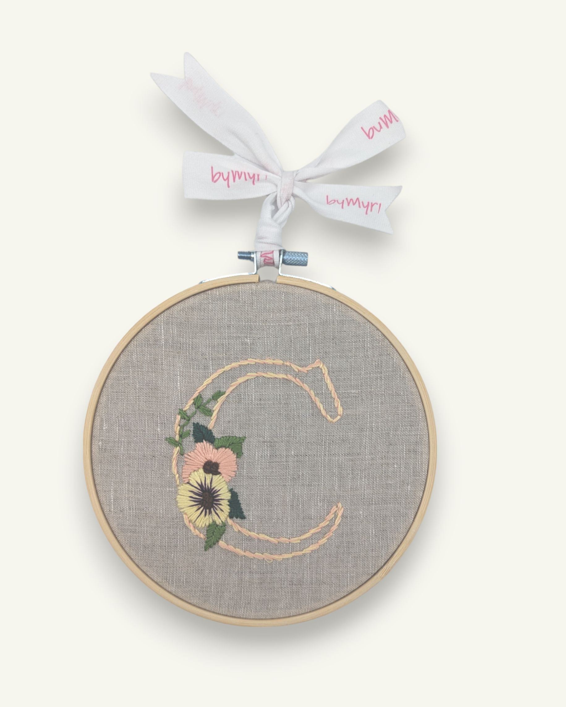 Este cuadrito con la inicial bordada de tu bébé quedará precioso en su cuarto.