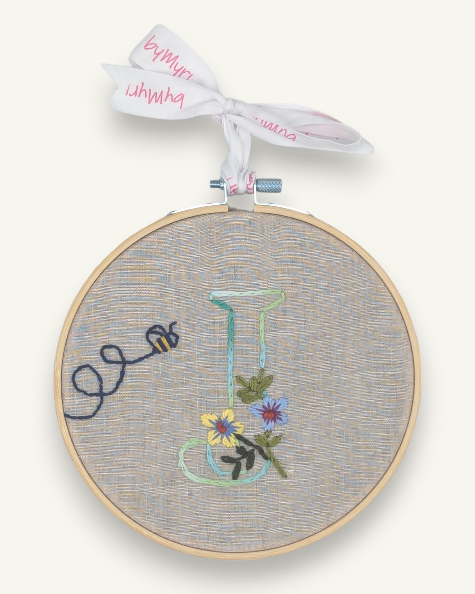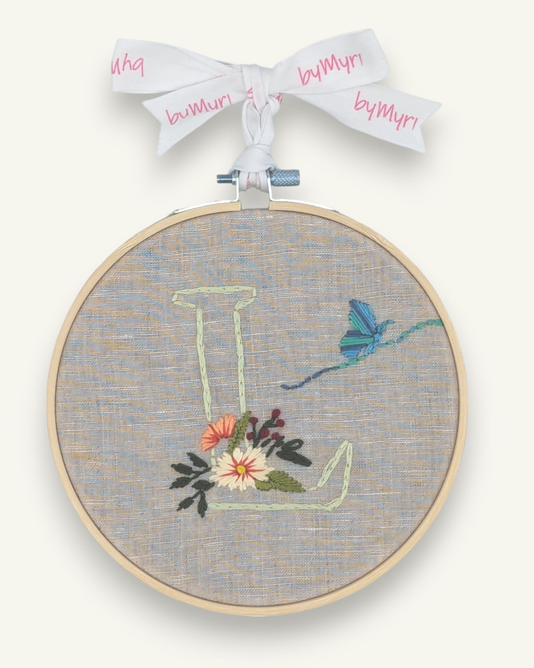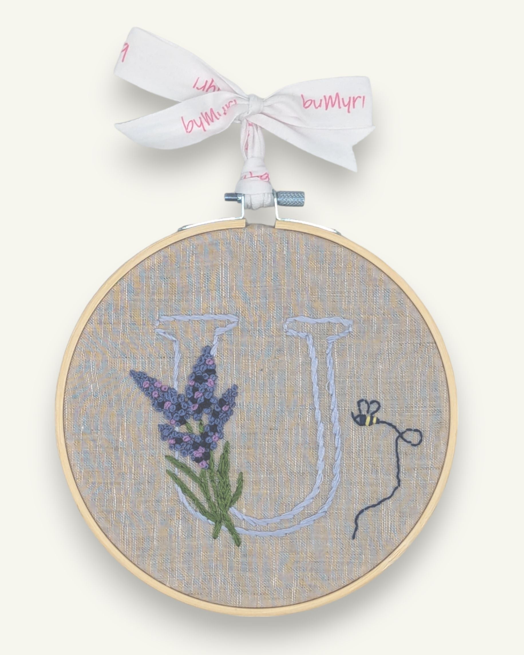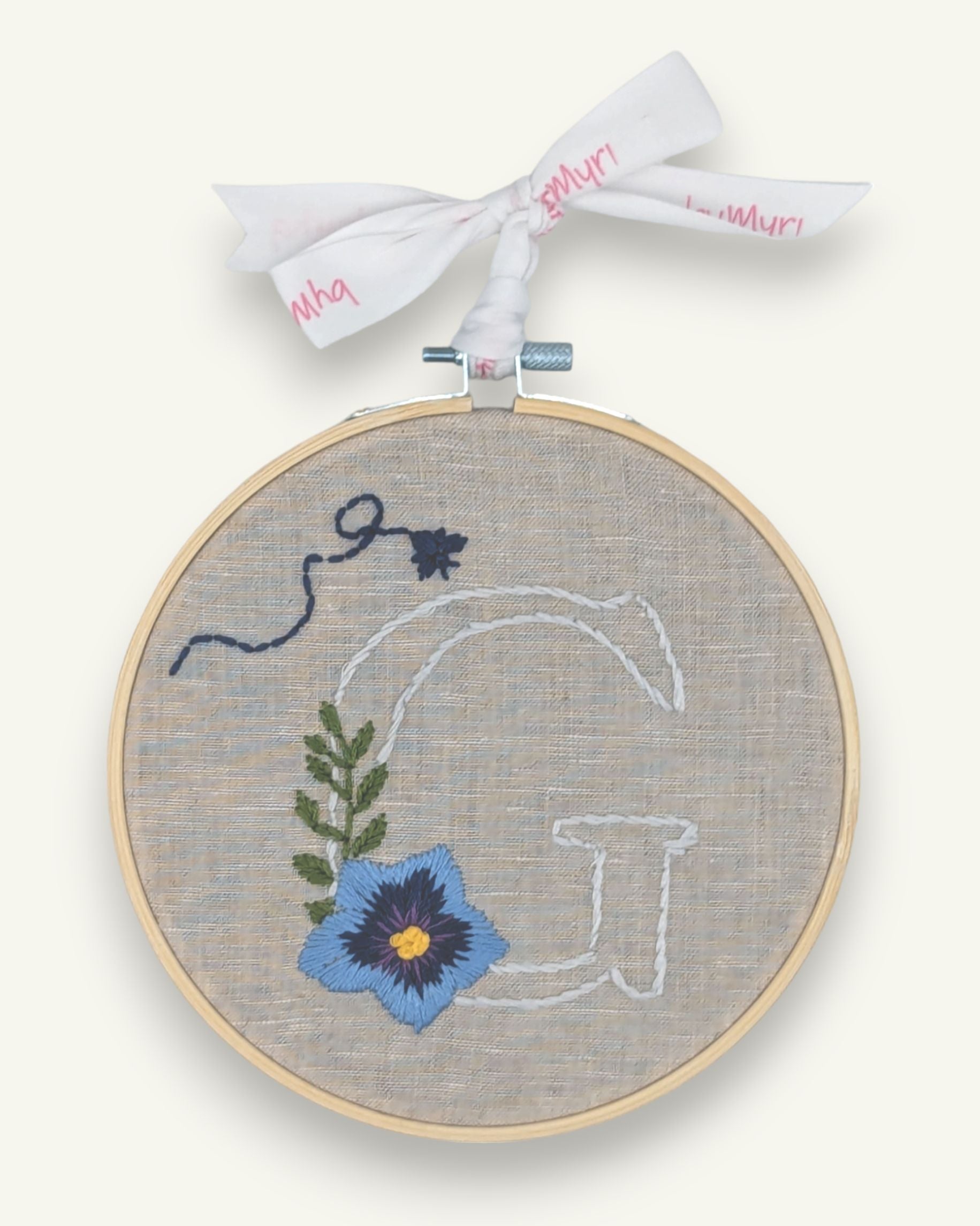 Este cuadrito con la inicial bordada de tu bébé quedará precioso en su cuarto.